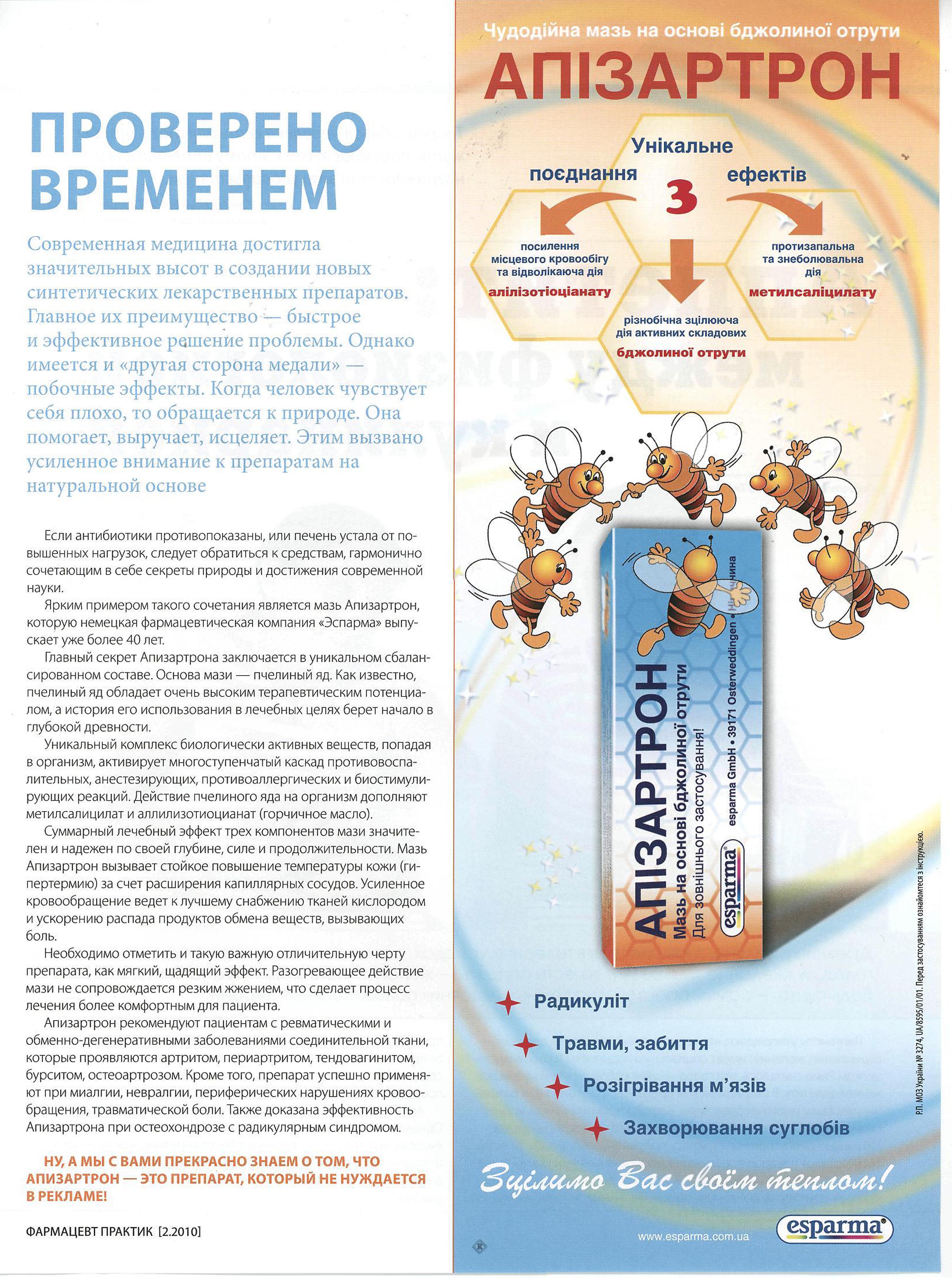 Ключевые слова: мазь Апизартрон, пчелиный яд, метилсалицилат, аллилизотиоцианат (горчичное масло).