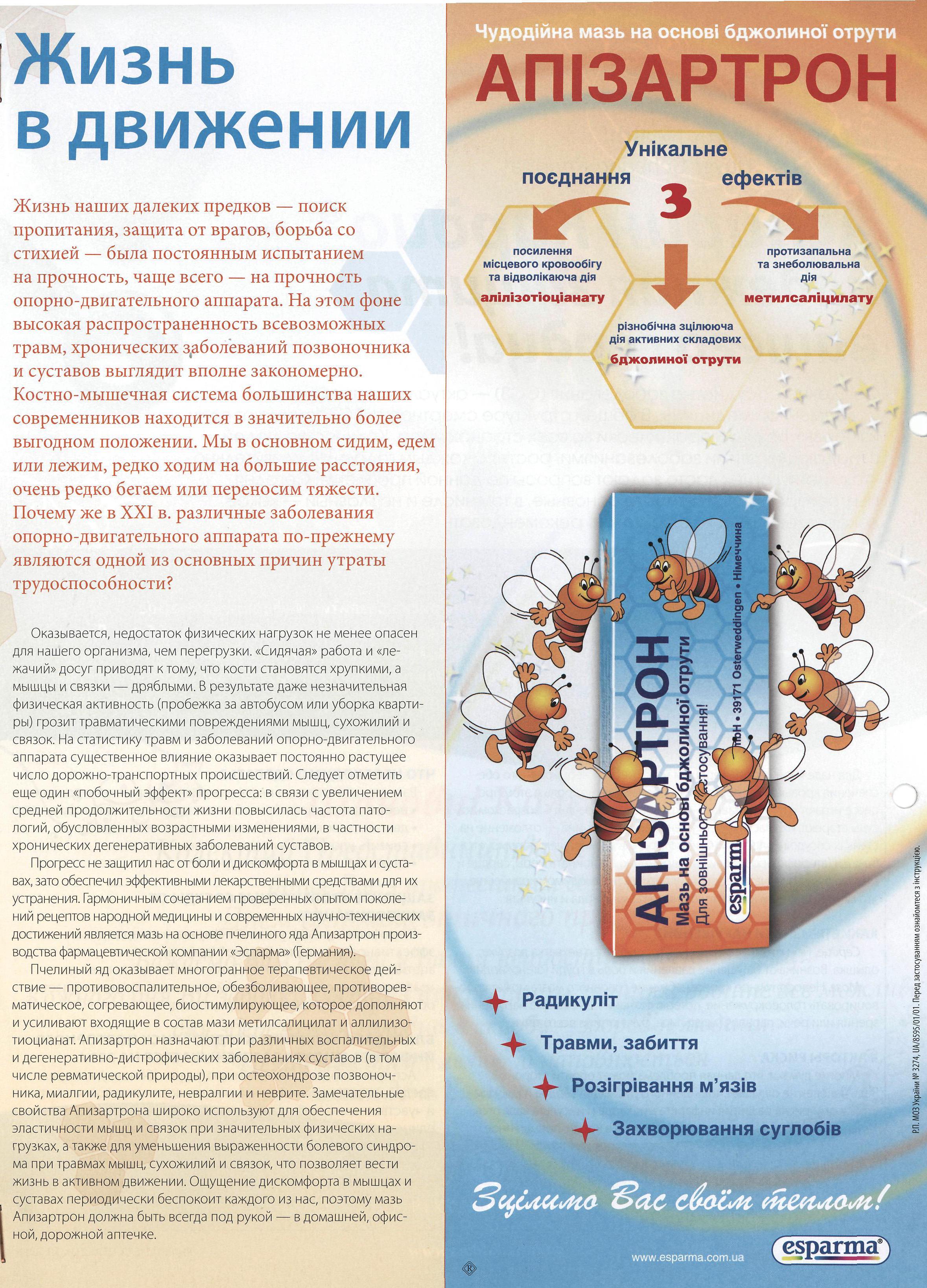 Ключевые слова: мазь Апизартрон, пчелиный яд, метилсалицилат, аллилизотиоцианат (горчичное масло), радикулит, остеохондроз, миалгия, неврит, невралгия.
