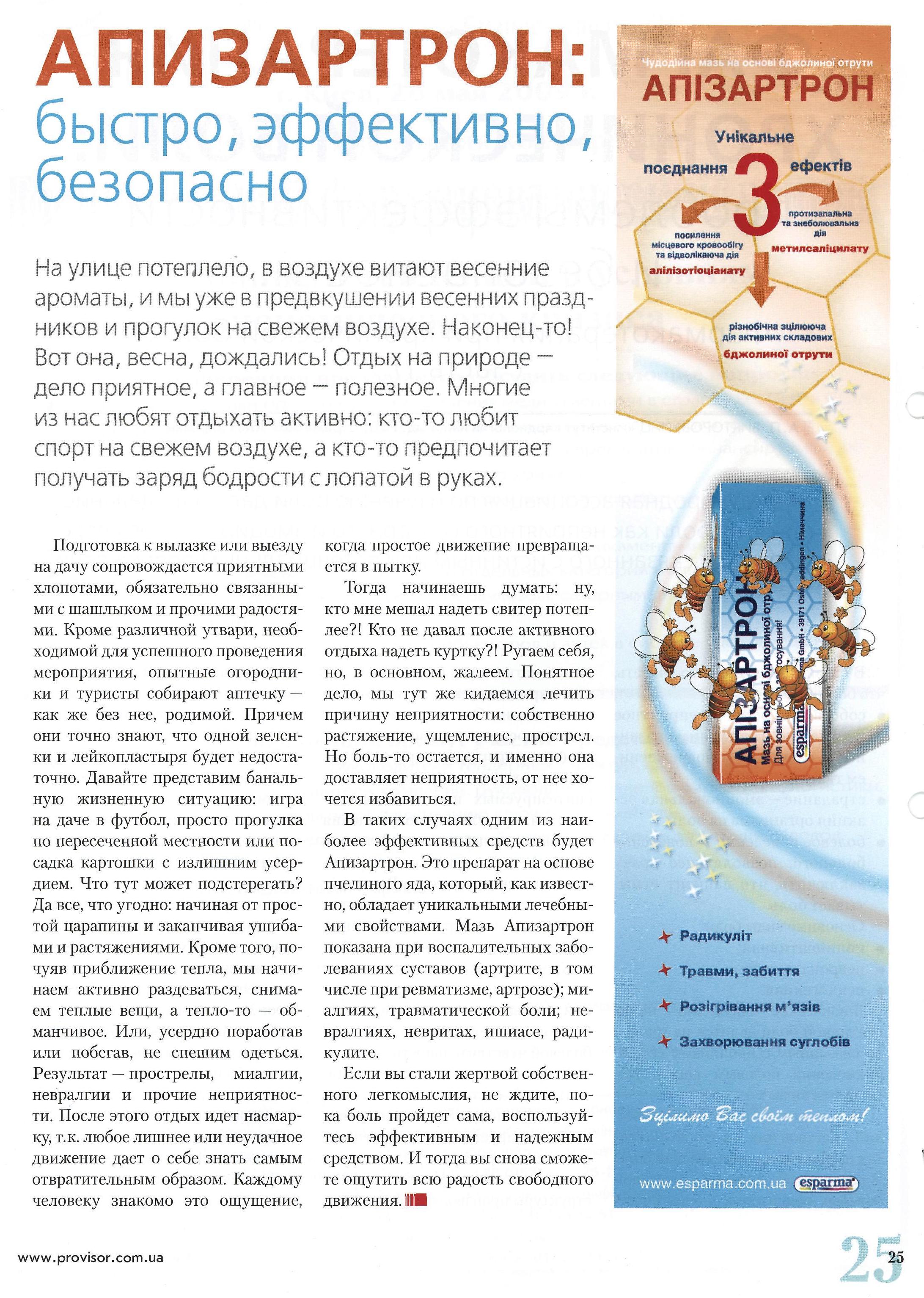 Ключевые слова: мазь Апизартрон, пчелиный яд, метилсалицилат, аллилизотиоцианат (горчичное масло), радикулит, артрит, артроз, остеохондроз, травматическая боль, неврит, невралгия.