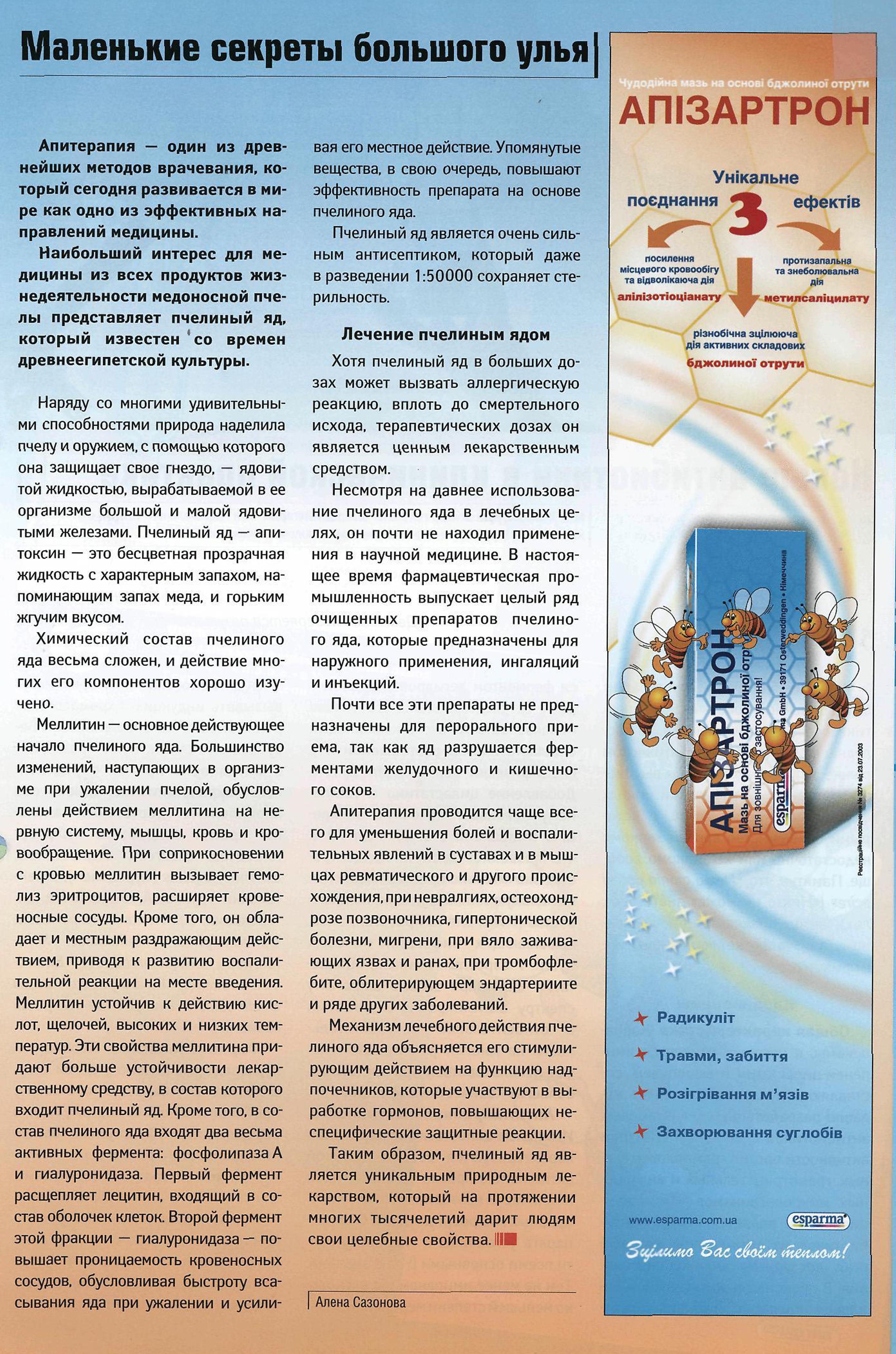 Ключевые слова: мазь Апизартрон, пчелиный яд, метилсалицилат, аллилизотиоцианат (горчичное масло)