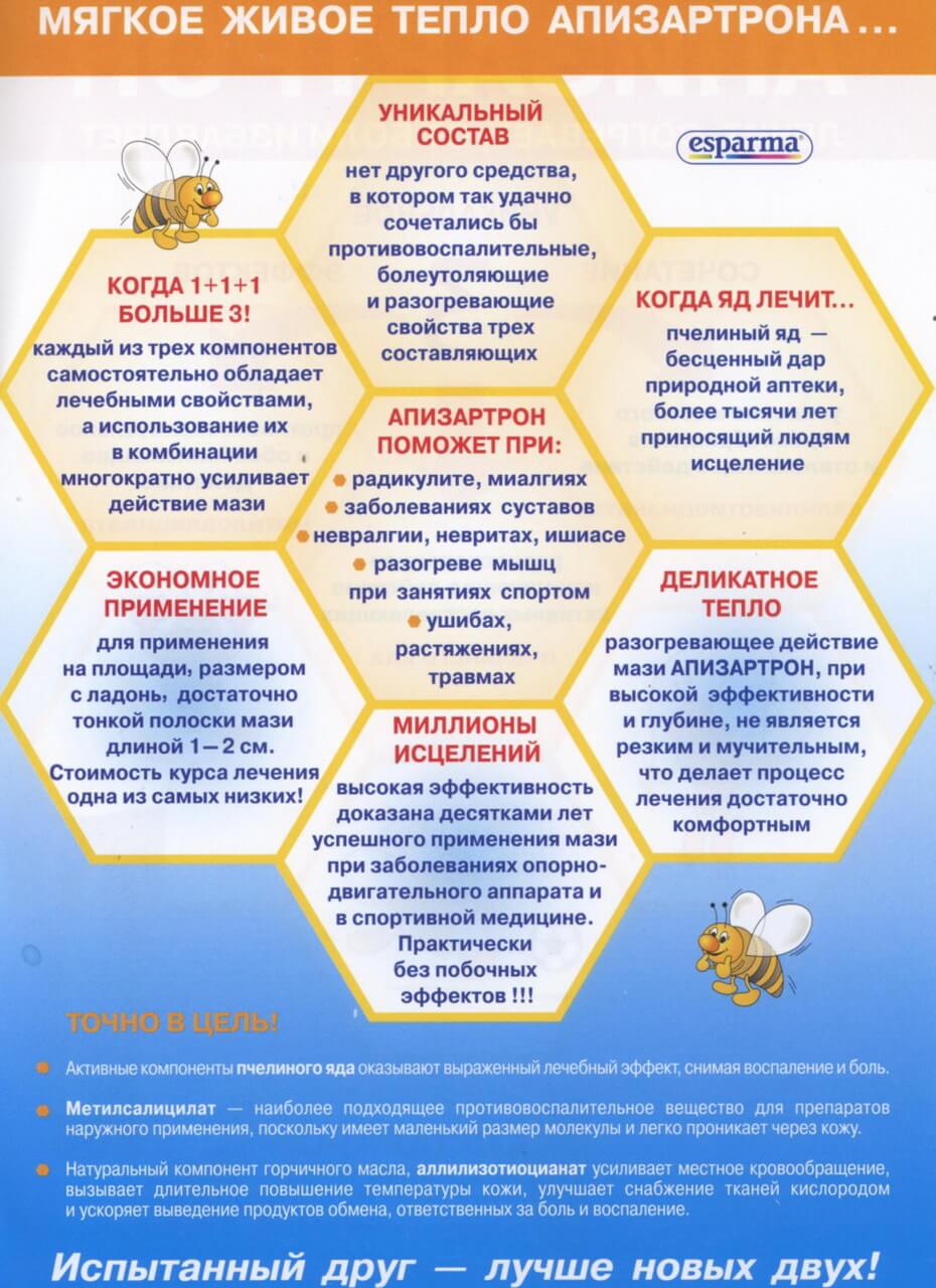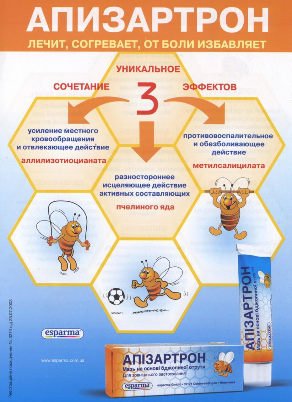 Ключевые слова: Апизартрон, пчелиный яд, радикулит, миалгия, заболевания суставов, невралгия, неврит, ишиас, разогрев мышц при занятиях спортом, ушибы, растяжения.