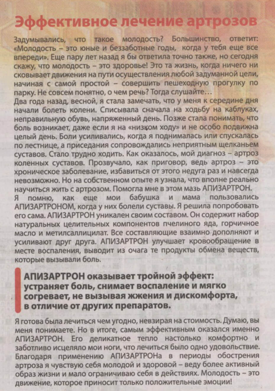 Ключевые слова: Апизартрон, пчелиный яд, горчичное масло, метилсаллицилат, артроз, боль в суставах.
