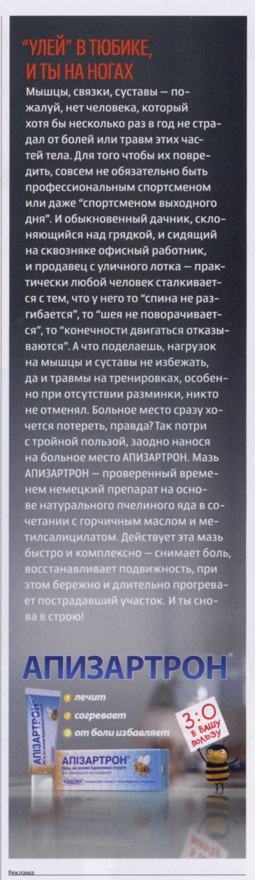 Ключевые слова: мазь Апизартрон, пчелиный яд, метилсалицилат, горчичное масло, мышечная боль, суставы, спортивные травмы.