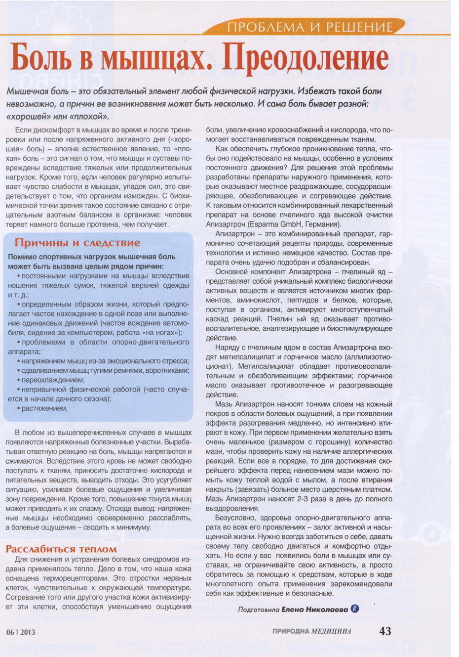 Ключевые слова: Апизартрон, пчелиный яд, метилсалицилат, горчичное масло, мышечная боль, суставы.