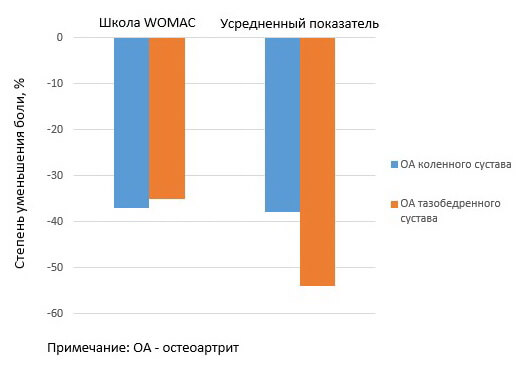 Рисунок. Средний показатель уменьшения боли после терапии препаратом мартинии душистой у пациентов с остеоартритом коленного и тазобедренного суставов