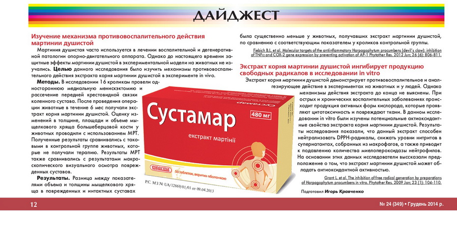 Ключевые слова: Сустамар, хондропротектор, экстракт мартинии, патологии опорно-двигательного аппарата, противовоспалительное действие экстракта корня мартинии душистой, аналгезирующее действие, антиоксидантная активность экстракта корня мартинии душистой.