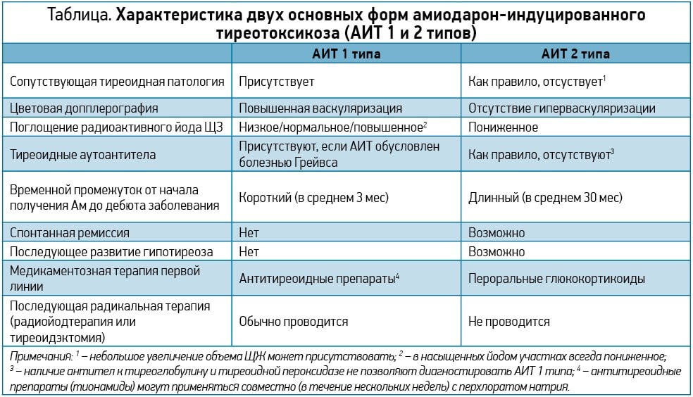 В рекомендациях ЕТА (2018) предложено классифицировать АИТ на два типа. АИТ 1-го типа представляет собой форму йод-индуцированного гипертиреоза, вызванную чрезмерным, неконтролированным биосинтезом тиреоидных гормонов автономно функционирующей тканью ЩЖ в ответ на избыточное поступление йода, что чаще развивается при узловом зобе, болезни Грейвса. Под АИТ 2-го типа понимают развитие деструктивного тиреоидита, возникающего, как правило, в нормальной ЩЖ. В большинстве случаев эта патология развивается в регионах с нормальным обеспечением йода и является самой распространённой формой АИТ (Таблица). Эксперты ЕТА выделяют также смешанный и неопределенный тип АИТ, при котором имеются признаки обоих форм.