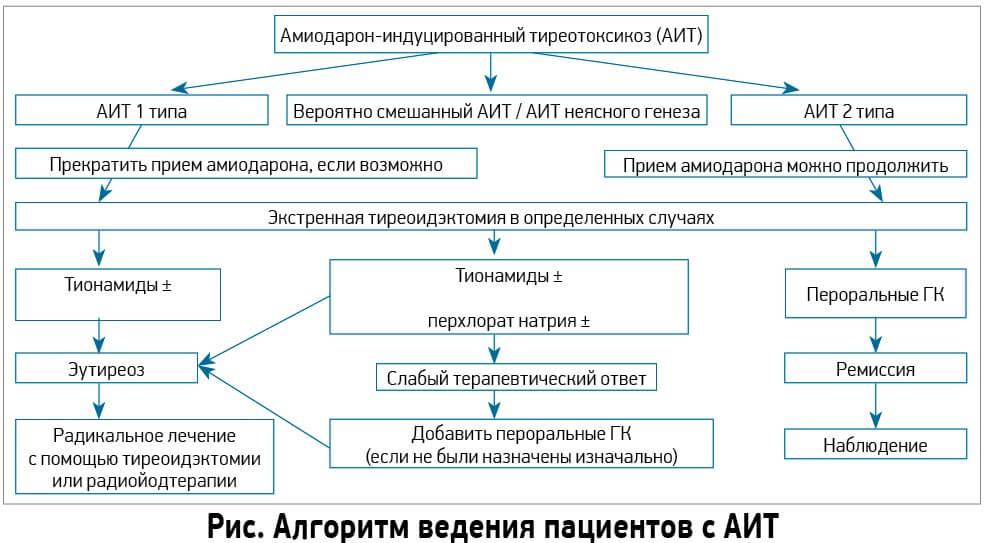 Учитывая сложность диагностики смешанной формы АИТ, эксперты ЕТА предусматривают два подхода для ведения таких больных. Первый предполагает назначение стартовой терапии с использованием тионамидов, перхлората натрия как в случае с АИТ 1-го типа. Если на протяжении 4-6 недель данная терапия не позволила добиться значимого улучшения самочувствия, то следует добавить глюкокортикоиды (ГК). Второй подход подразумевает безотлагательную инициацию комбинированной терапии (тионамид, перхлорат натрия, ГК). Тиреоидэктомия проводится в случае неэффективности комбинированной терапии (Рисунок).