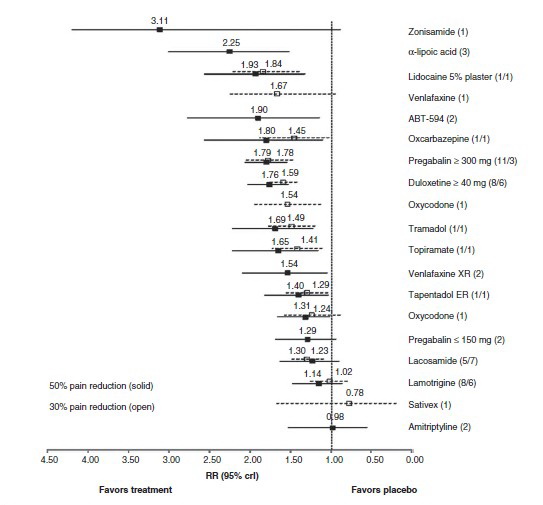 Рисунок 1. Итоговые даннные мета-анализа фармакотерапии различными препаратами нейропатической боли при ДПН