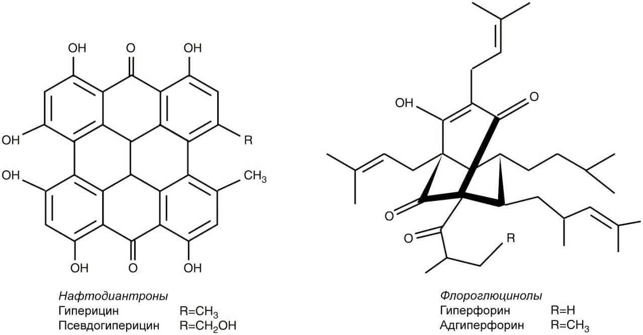 Экстракты зверобоя применяются в медицине многие века и уже давно доказали свою эффективность в многочисленных современных исследованиях. Экстракт зверобоя содержит минимум 10 биологически активных веществ. К ним относятся феноловые кислоты (хлорогеновая кислота), флаваноиды (кверцетин, кверцитрин, изокверцитрин, рутин, гиперозид, эпигенанин), производные флороглюцинола (гиперфорин, адгиперфорин) и нафтодиантроны (гиперицин, псевдогиперицин) (рис. 1).