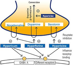 До недавнего времени считалось, что антидепрессивные и противовоспалительные свойства зверобоя связаны с нафтодиантронами [5], однако данные новых исследований показали, что в реализации этого механизма также играют значительную роль гиперфорин [6,7] и производные флаваноидов [8]. Сейчас принято считать, что различные эффекты зверобоя реализуются через суммацию и синергетическое действие всех его компонентов [9,10]. В исследовании антидепрессивных свойств экстракта зверобоя на молекулярном уровне было показано, что данная функция реализуется в ЦНС через ингибирование обратного захвата серотонина (эффект подобный антидепрессантам из группы СИОЗС), дофамина, норадреналина, ГАМК и L-глютамата [11]. В экспериментальном исследовании был показан нейропротективный эффект экстракта зверобоя и его способность улучшать когнитивную функцию [12]. В другом лабораторном исследовании, проведенном Tian с коллегами и опубликованном в 2014 году [13], была установлена роль адгиперфорина – недавно обнаруженного нового активного компонента экстракта зверобоя, в реализации мощной антидепрессантоподобной активности. По данным авторов, данный механизм реализовывается через ингибирование обратного захвата серотонина, дофамина и норадреналина, а также высокую аффинность связи с переносчиками серотонина и норадреналина. (рис.2)