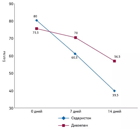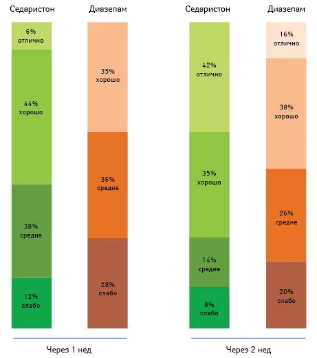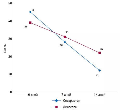Продолжительность испытания составила 14 дней. В течение 1-й недели пациенты принимали по 1 капсуле исследуемых препаратов 2 раза в сутки. Для усиления терапевтического эффекта на 2-й неделе у 27 (54%) и 35 (70%) пациентов 1-й и 2-й групп соответственно дозу препаратов повышали до 4 капсул в сутки в 2 приема. Таким образом, средняя суточная доза в обеих группах на протяжении всего периода лечения составила 2–3 капсулы препарата СЕДАРИСТОН или 4–6 мг диазепама.