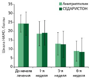 Клиническое изучение СЕДАРИСТОНа, проведенное в рамках двойных слепых, рандомизированных, плацебо-контролируемых исследованиях в европейских клиниках показало, что данный препарат обладает выраженным антидепрессивным, анксиолитическим и седативным эффектами, причем их выраженность сопоставима с эталонными препаратами антидепрессантов и анксиолитиков – амитриптилина и диазепама при лечении тревожно-депрессивных проявлений легкой и средней степени тяжести у пациентов с невротическими расстройствами, а также при дистимии [ 19, 30 ]. Было показано достоверное позитивное влияние СЕДАРИСТОНа на психовегетативную симптоматику, головную боль, боль в спине, мышечную боль, повышенную утомляемость, пассивность и др.