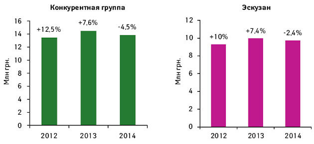 Опережающие по сравнению с конкурентной средой темпы развития объема аптечных продаж ЭСКУЗАН капли были достигнуты в 2013 г., а в сложном 2014 г. препарат продемонстрировал большую устойчивость по сравнению с конкурентной группой, объемы продаж лекарственных средств в которой сократились на 4,5%, а ЭСКУЗАНА капли — всего на 2,4% (рис. 2).