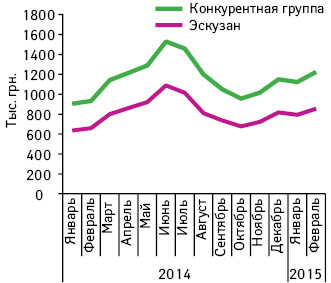 Аптечные продажи препарата ЭСКУЗАН капли, как и других лекарственных средств его конкурентной группы, характеризуются ярко выраженной сезонностью. Так, в теплое время года объем реализации ЭСКУЗАН капли увеличивается почти в 1,5 раза по сравнению с зимним периодом. Ежемесячная динамика аптечных продаж препарата в денежном выражении коррелирует с реализацией лекарственных средств конкурентной группы (рис. 3). Заслуживает внимание значительное увеличение объема аптечных продаж ЭСКУЗАН капли в мае–июне 2014 г., что позволяет ожидать такого же роста и в этот же период в 2015 г. Таким образом, уже сейчас аптекам стоит позаботиться о наличии на своих полках такого востребованного и популярного препарата, как ЭСКУЗАН капли. Ведь, несмотря ни на какие перипетии в стране и экономический кризис, к сожалению, проблема варикоза остается по-прежнему актуальной и особенно остро вопрос о лечении пациентов с этим заболеванием традиционно встает именно в конце весны — когда так хочется быть красивой и излучать здоровье.