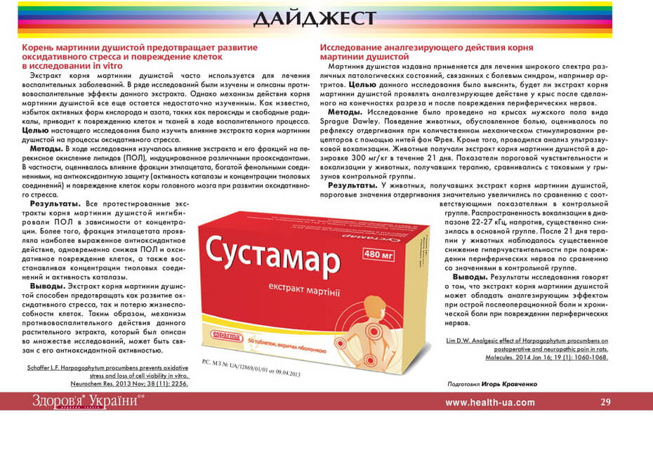 Ключевые слова: Сустамар, экстракт мартинии душистой, хондрпротектор, оксидативный стресс, аналгезирующее действие, повреждение периферических нервов.