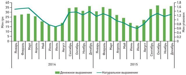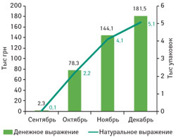 Для лекарственных средств, применяющихся при насморке, в том числе препаратов ксилометазолина, характерна выраженная сезонность в динамике продаж. Так, объем продаж данных лекарственных средств как в денежном, так и в натуральном выражении значительно увеличивается в период с сентября по апрель (рис. 2), оставаясь высоким на протяжении 8 мес в год. Поэтому адекватное пополнение товарного запаса в самый «горячий» период является залогом успеха аптеки.