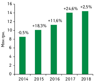 Динамика объема аптечных продаж препарата ЭСКУЗАН КАПЛИ в денежном выражении по итогам 2014–2018 гг. с указанием темпов прироста по сравнению с аналогичным периодом предыдущего года (розничные продажи без учета АР Крым и зоны проведения ООС)